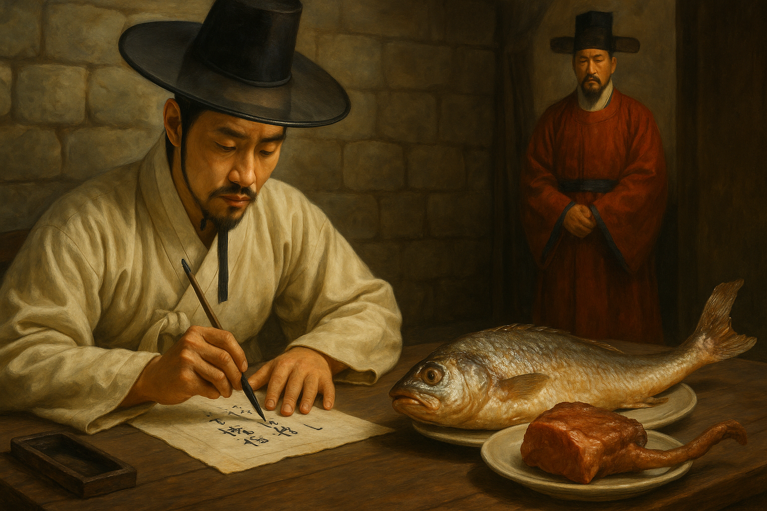 어느 날, 이 고을에 왕의 사신이 찾아와 선비들의 식견을 시험하겠다며 특이한 문제를 제시했습니다. 고기 한 마리와 생선 한 마리를 나눠줄 테니, 각각 한 부위만 골라 먹고 그 이유를 맛이 아닌 지혜로 풀어 글로 제출라고 했습니다.