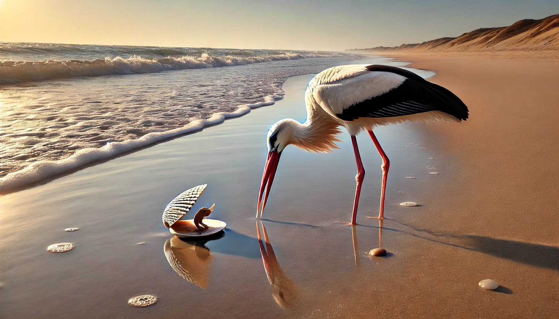 [강가에서 조개 한 마리가 햇볕을 쬐며 입을 벌리고 있었습니다. 그때 황새가 날아와 뾰족한 부리로 조갯살을 쪼았습니다. 놀란 조개는 단단히 입을 다물어 황새의 부리를 끼워 버렸습니다.