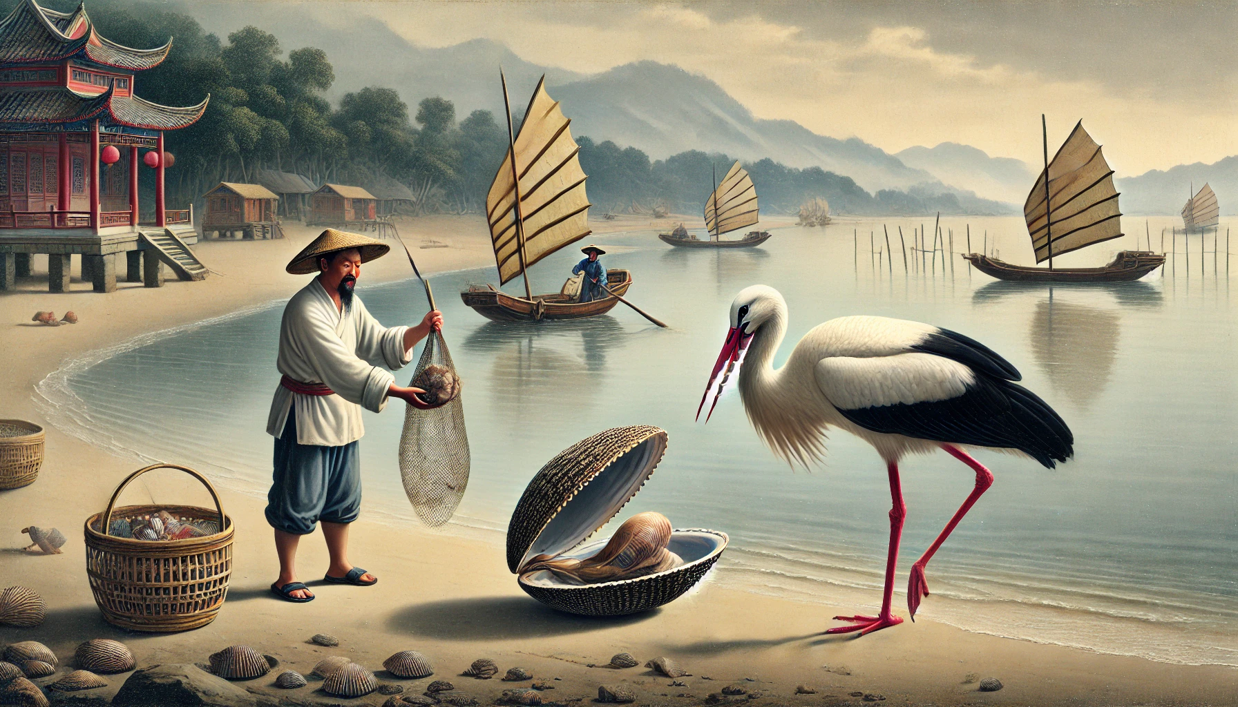 바로 그 순간, 강가를 지나던 어부가 이 광경을 목격했습니다. 그는 힘들이지 않고 조개와 황새를 함께 잡아버렸습니다. 두 생물이 다투는 동안 결국 제삼자인 어부가 이득을 챙긴 것입니다.]