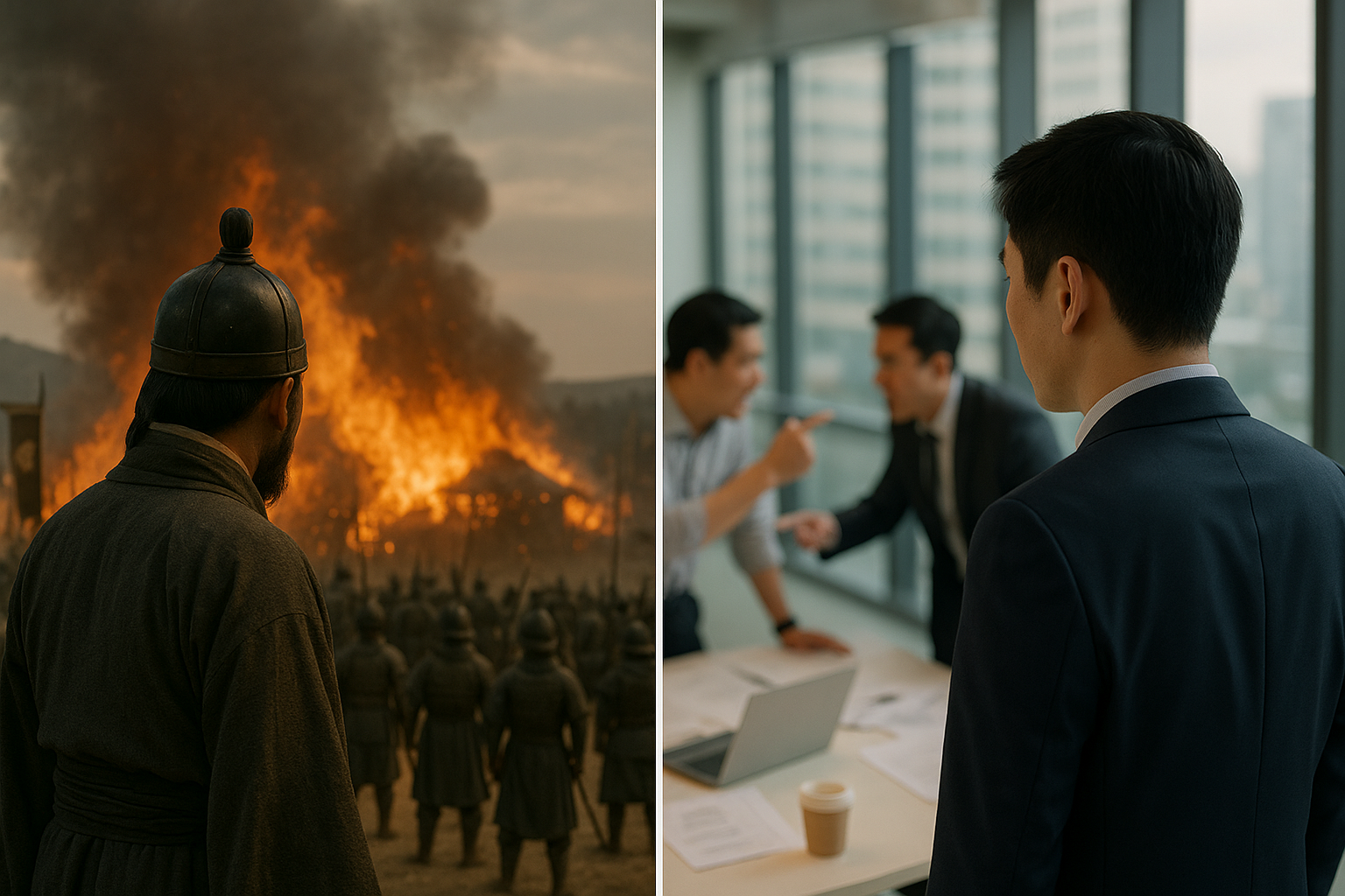 그런 식으로 그는 불필요한 희생 없이 전장을 선택했고, 혼란이 절정에 달해 모두 힘이 빠졌을 때 결정적인 한 방으로 패권의 흐름을 뒤집었습니다. 삼국지에서도 사마의가 촉과 오의 갈등을 일부러 방관하며 양쪽이 소모되는 상황을 기다렸다가, 정작 둘이 약해진 뒤에야 움직여 북방을 완전히 장악한 일 또한 같은 원리입니다.