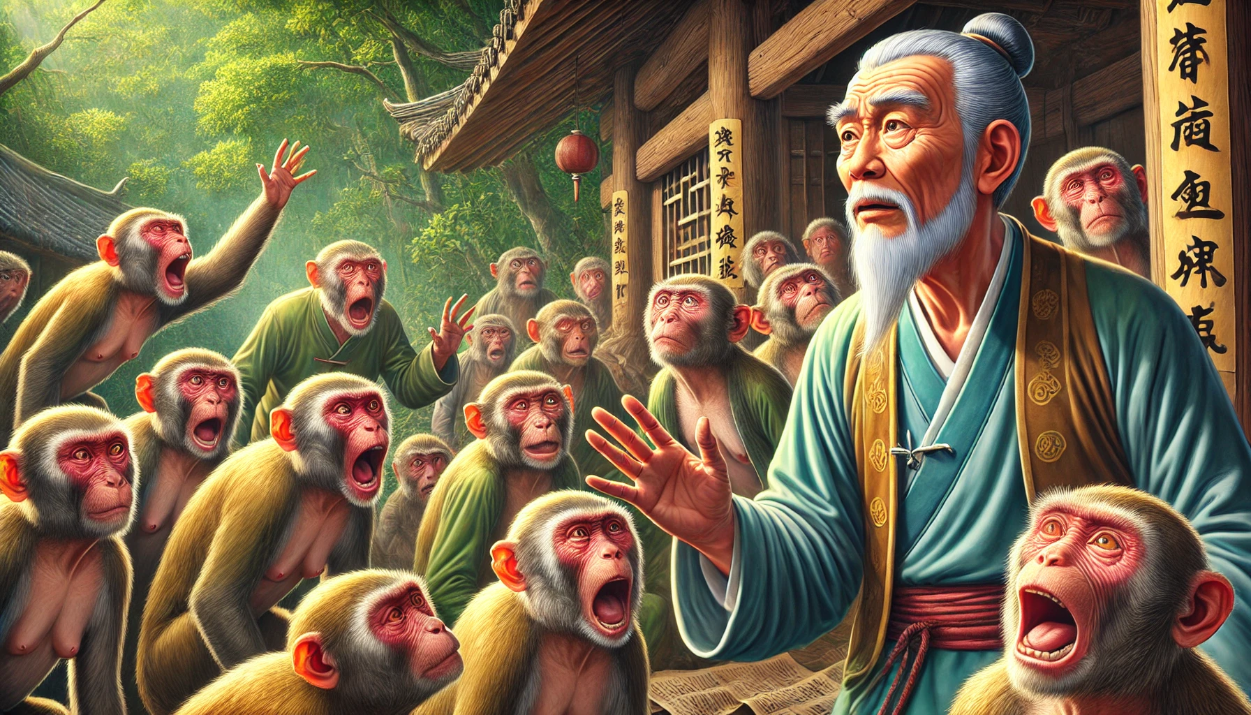 그러자 원숭이들은 갑자기 소란을 피우며 크게 반발했습니다. 서로 눈을 마주치며 웅성거리더니, 아침에 세 개만 주는 것은 부족하다며 불만을 터뜨렸습니다.