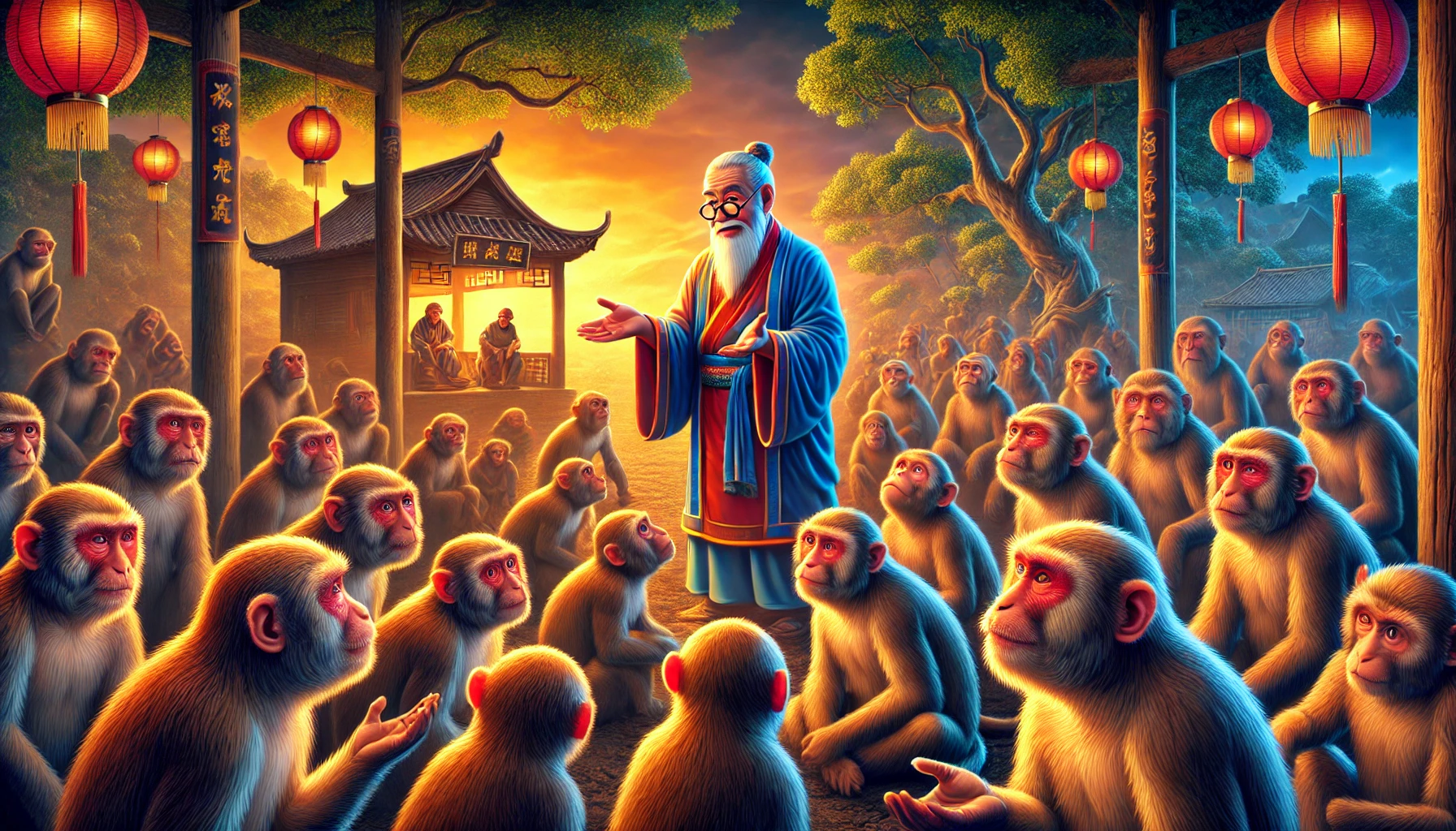 하루는 저공이 도토리가 다 떨어질 것을 걱정하며 고민에 빠졌습니다. 정든 원숭이들을 내다 팔 수 없었기에, 불만 없이 먹이량을 줄일 방법을 찾고자 했습니다.